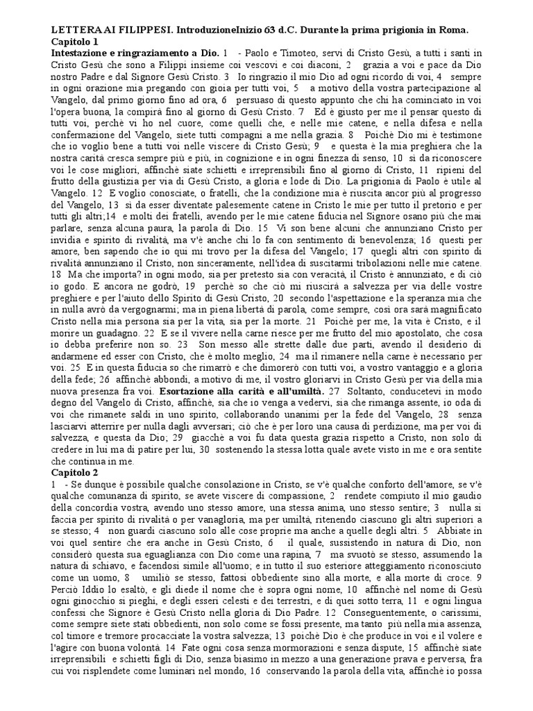 Lettera Ai Filippesi | PDF - Scribd Scarica ora LETTERA AI FILIPPESI. IntroduzioneInizio 63 d.C. Durante la prima prigionia in Roma. Capitolo 1 Intestazione e ringraziamento a Dio. 1 - Paolo e Timoteo, servi di Cristo Gesù, a tutti i santi in Cristo Gesù che sono a Filippi insieme coi vescovi e coi diaconi, 2 grazia a voi e pace da Dio